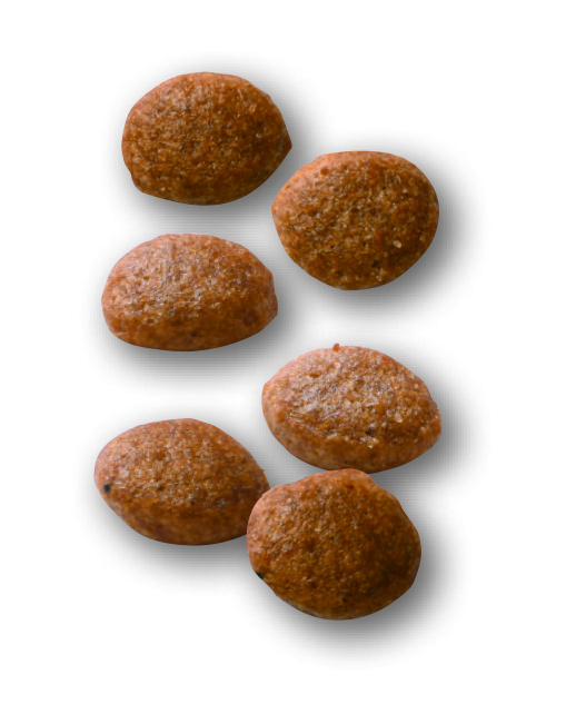 米、肉類(鶏、七面鳥、ダック)、コーンフラワー、動物性油脂、超高消化性小麦タンパク(消化率90%以上)、魚肉、加水分解タンパク(鶏、七面鳥)、植物性繊維、コーングルテン、酵母および酵母エキス、魚油、大豆油、フラクトオリゴ糖、マリーゴールドエキス(ルテイン源)、小麦粉、アミノ酸類(DL-メチオニン、タウリン)、ミネラル類(Cl、Na、K、Ca、Zn、P、Mn、Fe、Cu、Se、I)、ビタミン類(コリン、E、A、ナイアシン、葉酸、ビオチン、B2、パントテン酸カルシウム、B1、B6、D3、B12)、酸化防止剤(ミックストコフェロール、ローズマリーエキス)