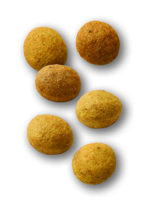 コーンスターチ、加水分解フェザーミール(アミノ酸およびオリゴペプチド)、コプラ油、大豆油、植物性繊維、動物性油脂、チコリー、魚油(オメガ3系不飽和脂肪酸〔EPA+DHA〕源)、フラクトオリゴ糖、マルトデキストリン、デキストロース、マリーゴールド(ルテイン源)、アミノ酸類(DL-メチオニン、L-リジン、L-チロシン、タウリン、L-トリプトファン、L-アラニン、L-ヒスチジン、グリシン)、ゼオライト、乳化剤(グリセリン脂肪酸エステル)、ミネラル類(Ca、K、P、Mn、Zn、Fe、Cu、Se)、ビタミン類(コリン、E、C、ナイアシン、パントテン酸カルシウム、B12、ビオチン、B6、B2、B1、A、葉酸、D3)、酸化防止剤(ミックストコフェロール、ローズマリーエキス)