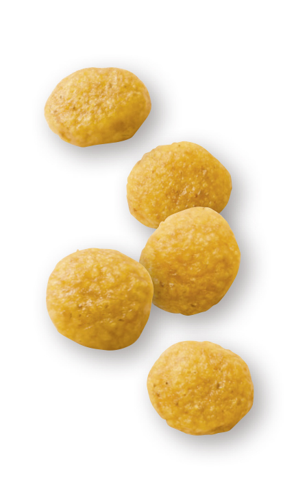 コーン、超高消化性小麦タンパク(消化率90%以上)、米、タピオカ、動物性油脂、コーングルテン、加水分解タンパク(鶏、七面鳥)、チコリー、大豆油、魚油(オメガ3系不飽和脂肪酸〔EPA+DHA〕源)、亜麻の種子、フラクトオリゴ糖、ルリチシャ油、マリーゴールド(ルテイン源)、アミノ酸類(L-リジン、タウリン、DL-メチオニン)、乳化剤(グリセリン脂肪酸エステル)、ゼオライト、ポリリン酸ナトリウム、ミネラル類(Cl、Ca、K、P、Na、Zn、Mg、Mn、Fe、Cu、I、Se)、ビタミン類(コリン、E、ナイアシン、C、パントテン酸カルシウム、B6、B2、B1、葉酸、A、ビオチン、B12、D3)、保存料(ソルビン酸カリウム)、酸化防止剤(ミックストコフェロール、ローズマリーエキス)