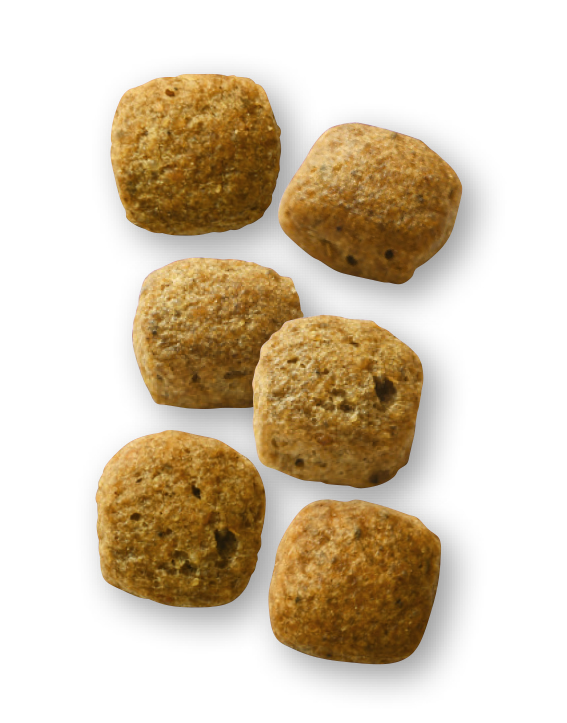 米、コーン、肉類(鶏、七面鳥、ダック)、大麦、加水分解タンパク(鶏、七面鳥、魚)、ビートパルプ、動物性油脂、酵母および酵母エキス、サイリウム、魚油(オメガ3系不飽和脂肪酸〔EPA+DHA〕源)、フラクトオリゴ糖、加水分解酵母(マンナンオリゴ糖源)、マリーゴールド(ルテイン源)、アミノ酸類(DL-メチオニン、タウリン)、乳化剤(グリセリン脂肪酸エステル)、ゼオライト、ミネラル類(Cl、Na、Ca、K、P、Zn、Mn、Fe、Cu、Se、I)、ビタミン類(コリン、E、C、ビオチン、A、パントテン酸カルシウム、ナイアシン、B6、B12、B1、B2、D3、葉酸)、保存料(ソルビン酸カリウム)、酸化防止剤(ミックストコフェロール、ローズマリーエキス)