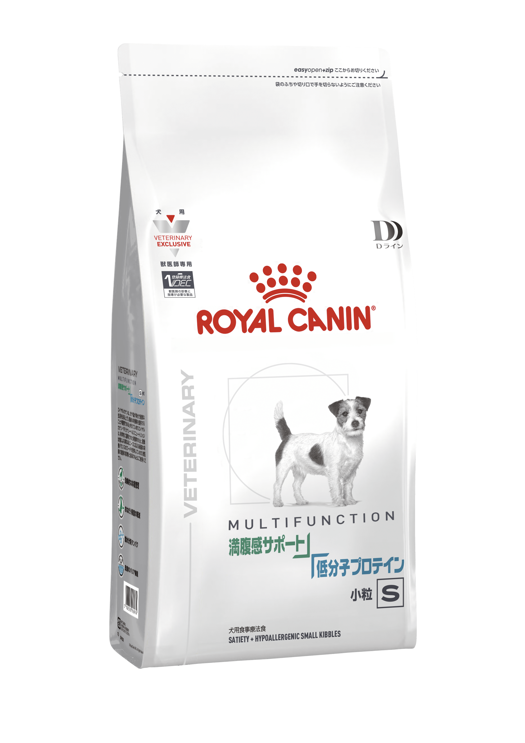 犬用 満腹感サポート+低分子プロテイン 小粒は、食物アレルギーによる皮膚疾患・消化器疾患のある犬、および減量の必要な犬に給与することを目的として、特別に調製された食事療法食です。減量のために摂取カロリーを制限した場合でも、食事量を確保するために食物繊維を増量し、また必要なタンパク質やビタミン・ミネラルなどが充分に摂取できるように調製されています。この製品は、食物アレルギーの原因となりにくい加水分解したタンパク源を使用しています。