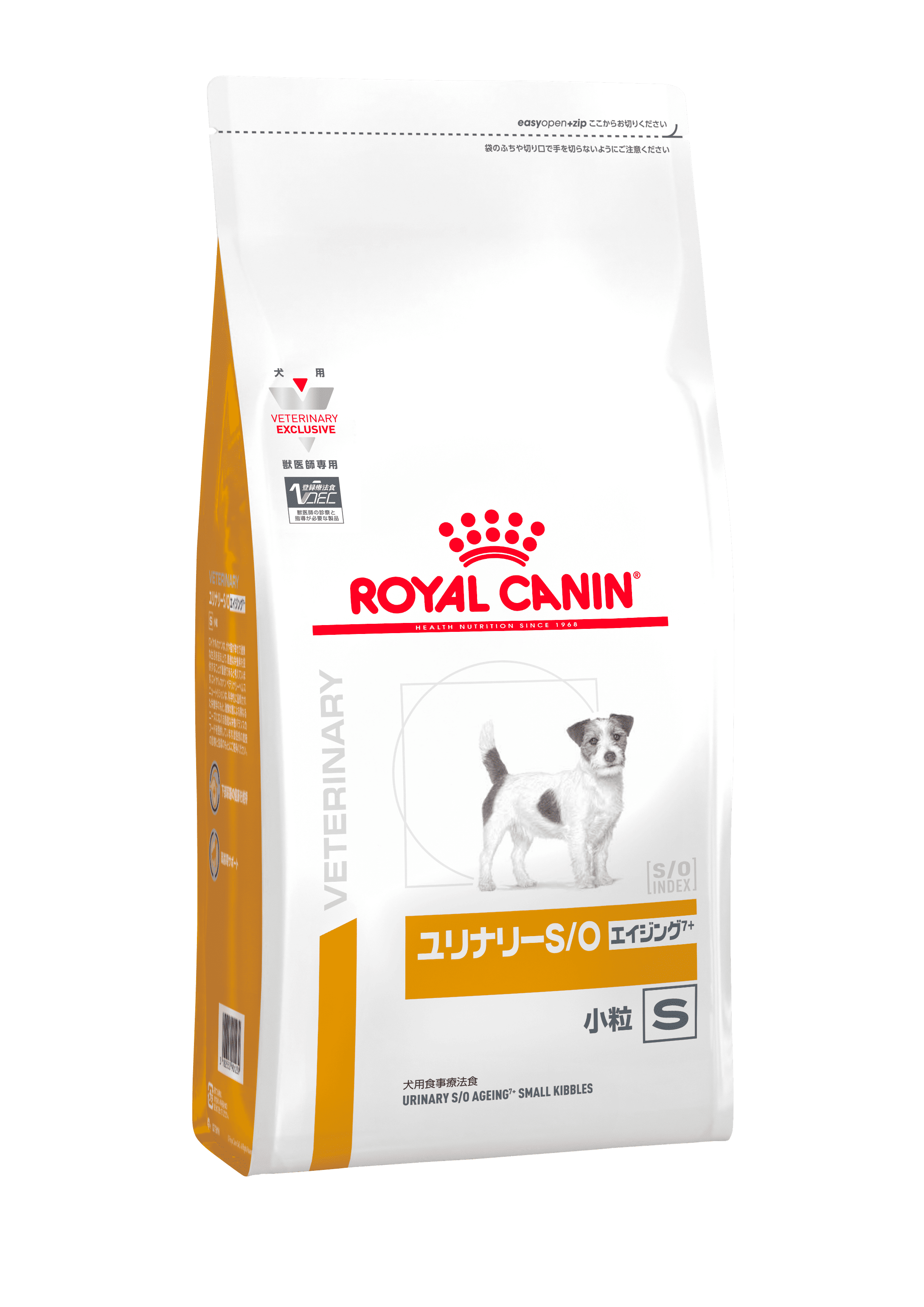 犬用 ユリナリーS/O エイジング7+ 小粒は、下部尿路疾患(ストルバイト結石症およびシュウ酸カルシウム結石症)の犬に給与することを目的として、特別に調製された食事療法食です。この食事は、マグネシウムなどのミネラル成分を調整しています。